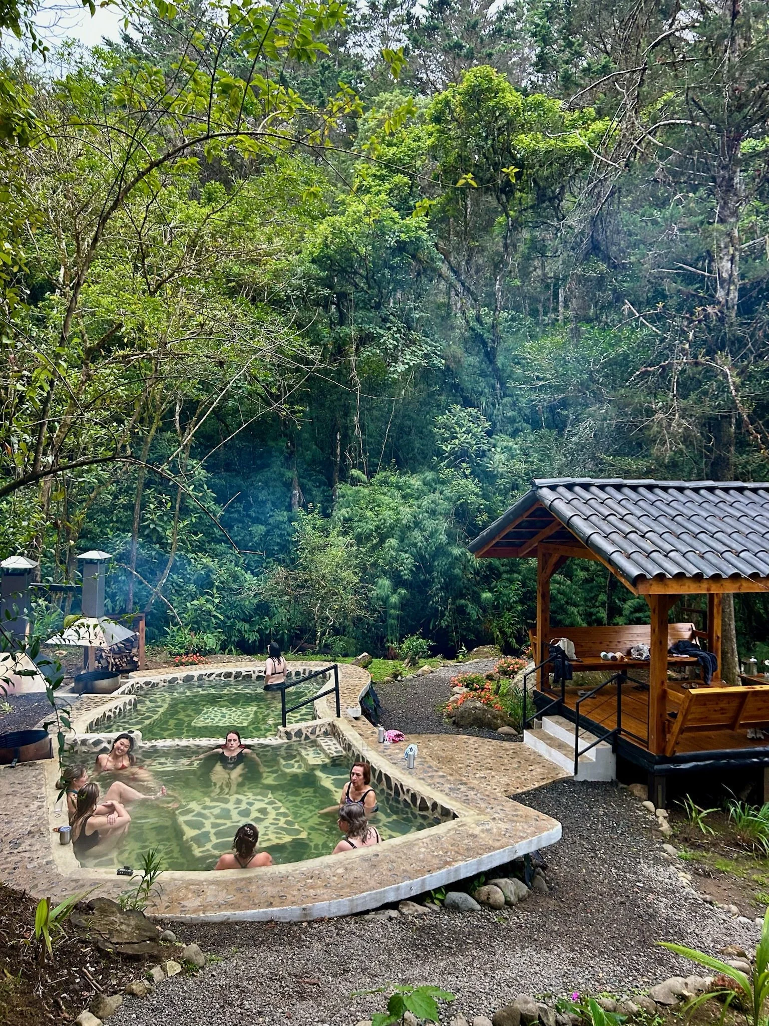 • Access to hot pools, forest trails, gardens, and a private riverbank